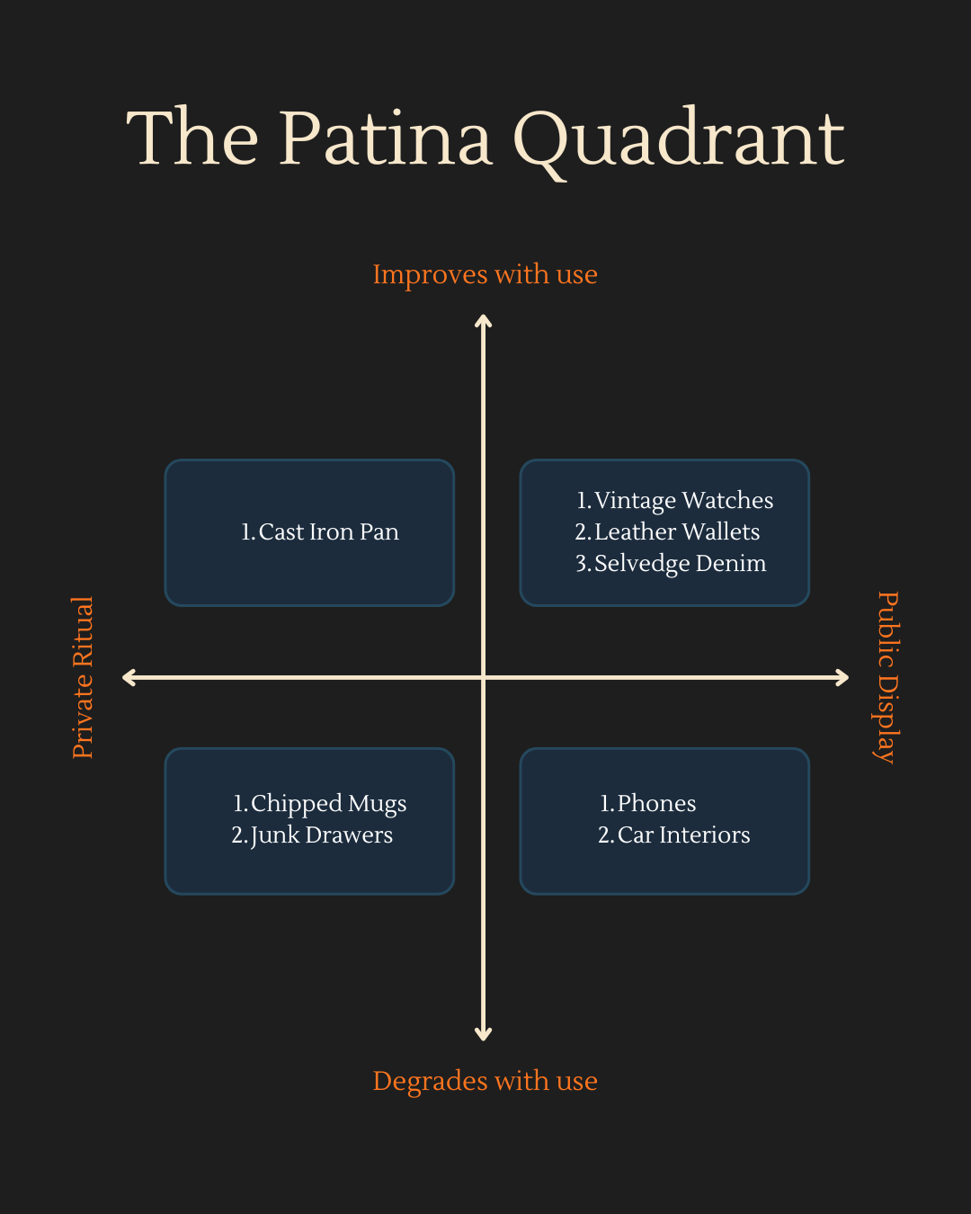 The important move is not “ruin your things.” It’s to realize there are two grammars of value: pristine-value (unmarked originality) and patina-value (storied authenticity). Different categories reward different grammars. Phones prize pristine; heritage boots prize patina. Confusion between grammars is what drives anxiety.